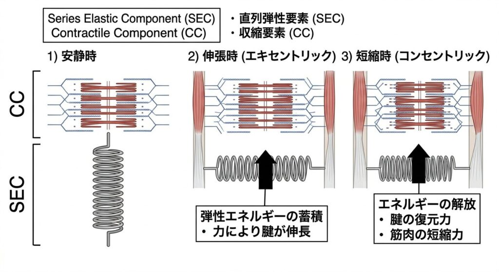 - 伸張局面(エキセントリック相): 着地や予備動作で筋肉・腱が急激に引き伸ばされる局面。