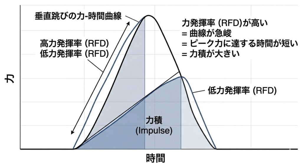 高く跳ぶためには、「大きな力」を「適切な時間」地面に加え続ける必要があります。ここで重要なのは、単に筋力が強いだけでなく、地面を押している短い時間の間にどれだけ効率的に力を立ち上げられるか(力発揮率:RFD)です。