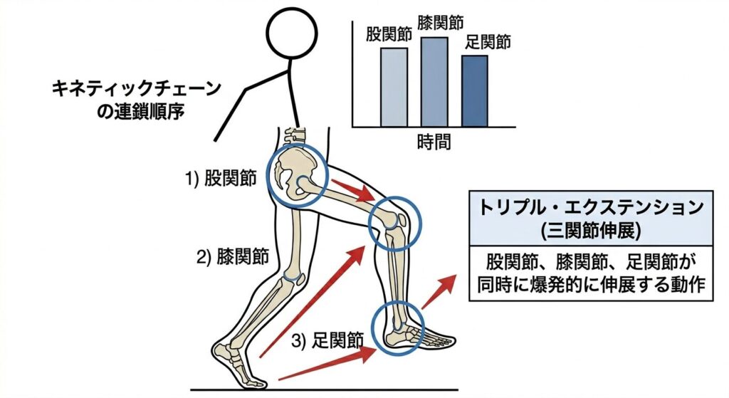 - トリプル・エクステンション(三関節伸展): 股関節、膝、足首の3つの関節が同時に、かつ爆発的に伸びる動作です。