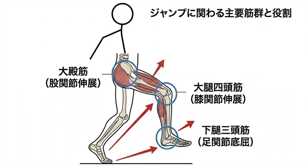 - 大殿筋・ハムストリングス:股関節を強力に伸ばし、ジャンプの爆発力を生みます。